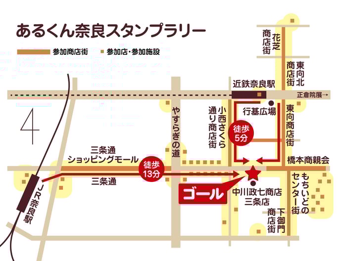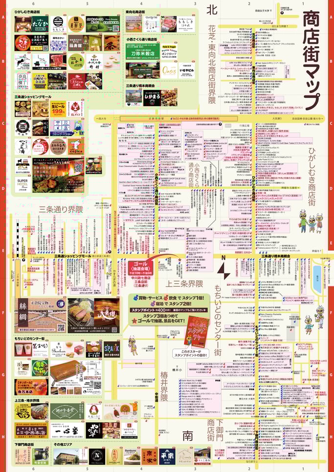 近鉄奈良駅〜JR奈良駅周辺の商店街や参加店(400カ所以上)にて、「買物・サービス利用・飲食・宿泊」でスタンプを押印します