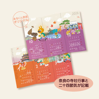 奈良の年間行事、奈良の名所、二十四節気などが記載されたカレンダーです。折りたたんで小さく、広げて大きく使えます。カレンダーの解説書付き。