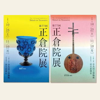 限定数で、非売品の正倉院展公式ポスター「瑠璃坏」とそのデザインと対になっている「桑木阮咸」のハガキのセットもあります。