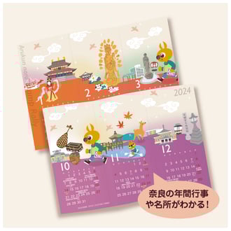 奈良の年間行事、奈良の名所、二十四節気などが記載されたカレンダーです。折りたたんで小さく、広げて大きく使えます。カレンダーの解説書付き。