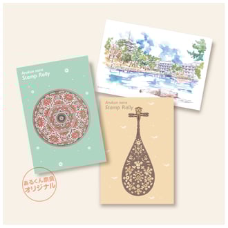 今年出陳の宝物「漆背金銀平脱八角鏡」「金銀平脱皮箱」をモチーフにしたはがきと瑞々しい水彩で描かれた奈良ひとまち百景はがきです。